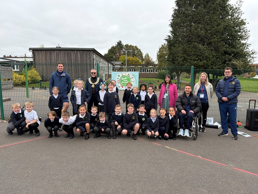 Pictured above: Year 3 pupils from Woodbridge Junior School in Alfreton pictured with Councillor Steve Marshall-Clarke, the Mayor of Amber Valley; Councillor Amina Burslem from Amber Valley Borough Council; and members of the Amber Valley School Sports Partnership — Rob Shaw, Glen Gent, Claire Dunster, and Jak Smith — during the launch of Beat the Street Alfreton.